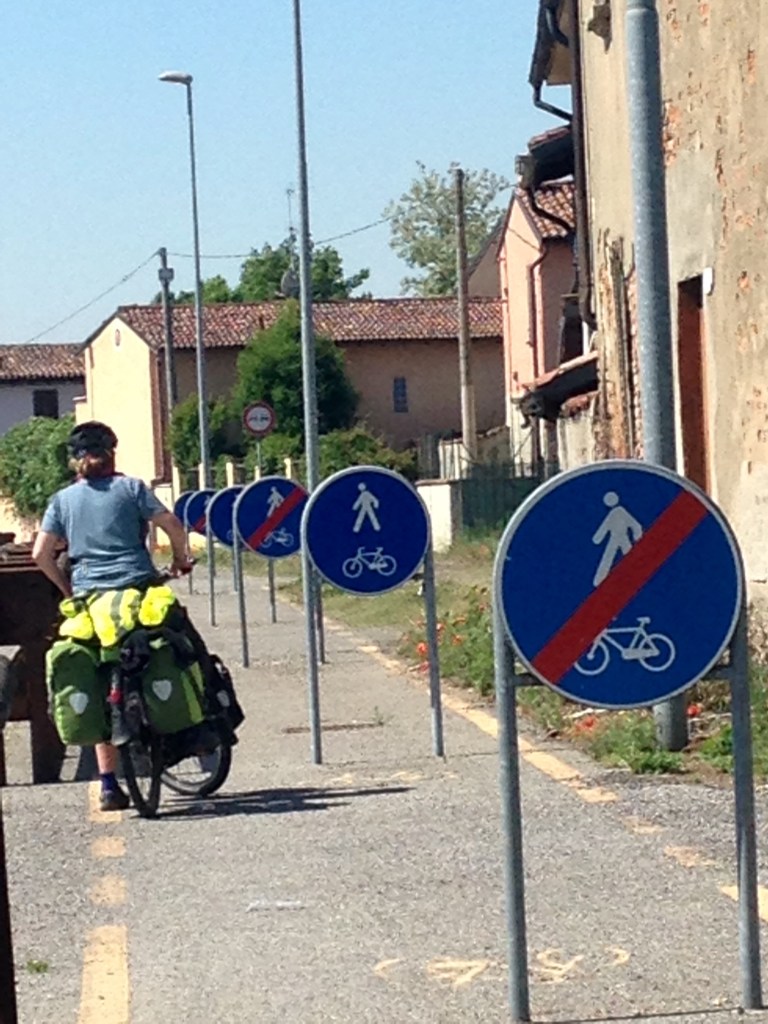 Al momento non vedo nessuna soluzione nel creare una rete ciclabile in Italia perché ogni Comune si organizza autonomamente e non c’è coordinamento tra regioni. Il ciclo-turista è diverso dal ciclista del fine settimana che indossa il completo sponsorizzato. Con la bicicletta carica, il ciclo-turista pedala lentamente in cerca di percorsi panoramici o di interesse naturalistico o culturale e cerca prevalentemente di trovare percorsi senza traffico pesante. Altra caratteristica è la non familiarità delle strade che lo porta a consultare, quando possibile, gps o google map, e questo non aiuta per niente a viaggiare in sicurezza e alla scoperta di luoghi sconosciuti. È stato solo grazie alla mia familiarità con certe zone, prevalentemente Toscana, che abbiamo potuto letteralmente esplorare la regione in modo nuovo e riscoprendola completamente. Dove non c’è stata familiarità ci sono stati momenti di rabbia. In Umbria, sulla strada provinciale SP 76 abbiamo avuto momenti di panico quando, a causa di lavori sulla superstrada che stanno costruendo tra Umbria e Marche, non hanno pensato di mettere un cartello di divieto alle biciclette di transitare a causa di traffico pesante. Il ciclista locale forse conosce alternative ed è familiare con la zona, ma chi non lo è, può trovarsi in serio pericolo.