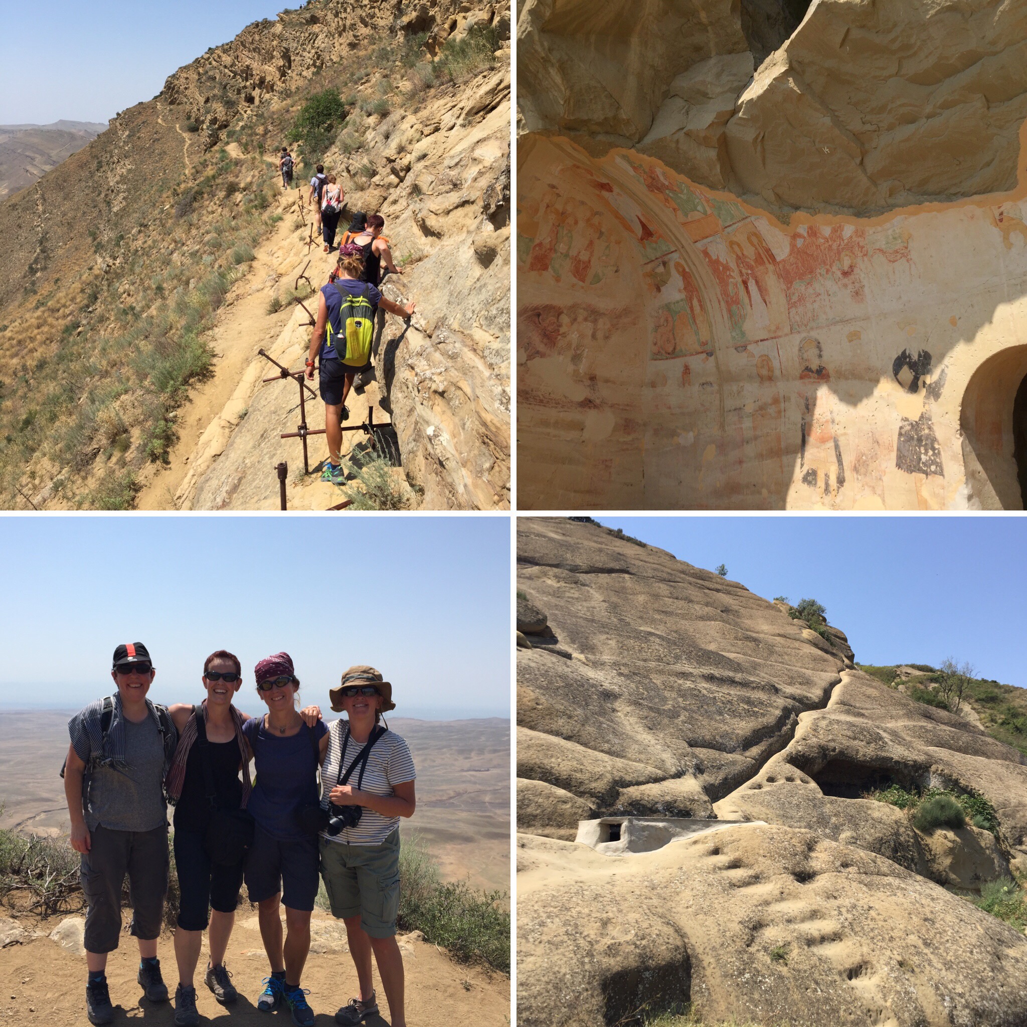On another clean bill of health day we took a tour to the cave monasteries of David Gareja, which sat on the borders of Azerbaijan and Georgia. This semi desert land was atmospheric and the artificial caves built and housed approx 6,000 holy men. Again we were left amazed and the human endeavour to build and worship in such a location. Now arid, barren and hostile in summer but we were told thousands of years ago this would have been a fertile land. What I love about tourist developing countries is the lack of H&S and that anything goes. The walk for many was too much and we lost half the group as either they were unfit or the prospect of walking a thin trail was too dangerous! In fact it was.