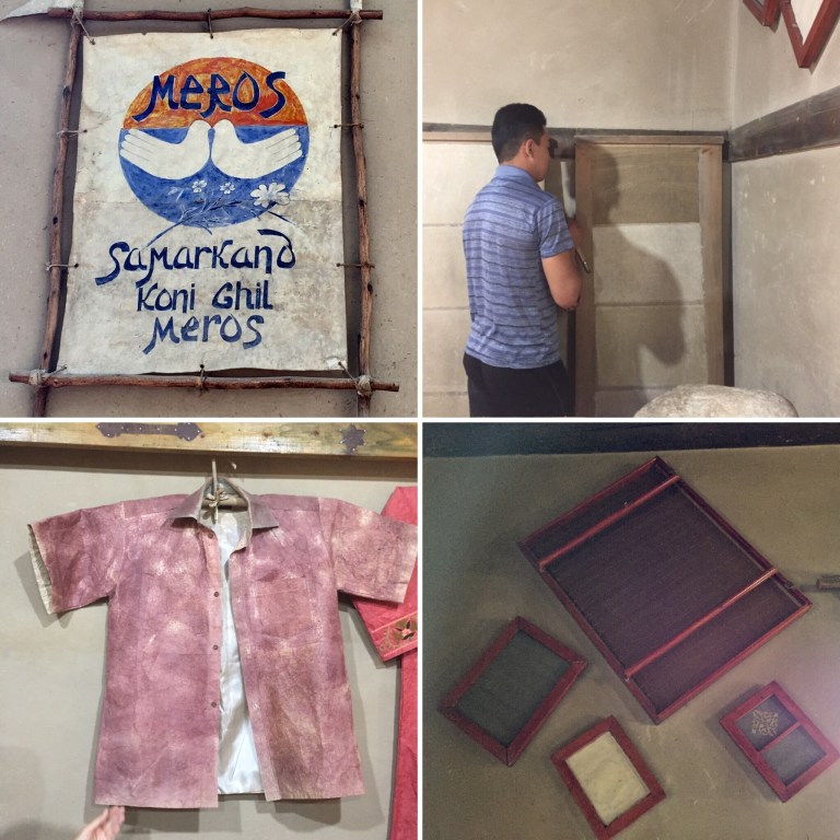 Meros have been reviving the craft of handmade paper for 18 years and and the workshop produces many artefacts and even clothing made from Mulberry paper. It began through a UNESCO (1995) conference where it was highlighted that there was a need to protect the handcraft and skills within the country. The history of paper-making in Samarkand was pivotal within the region and the Silk Road. Mulberry bark/ paper has a longevity that insects find impossible to destruct. Paper made from mulberry has a yellow hue to it and this is also said to be beneficial in calligraphic work as the contrast is less harsh. Paper making came about here in Samarkand due to several factors: In 751 Chinese soldiers were captured after an invasion into Central Asia. Many of these men were artisans in paper manufacturing and were forced to reveal the art of such fine and ink proof paper-making. Also Samarkand was a key place on the Silk Road so documentation was needed and the transformation of knowledge and religion, came with the use of paper recordings.