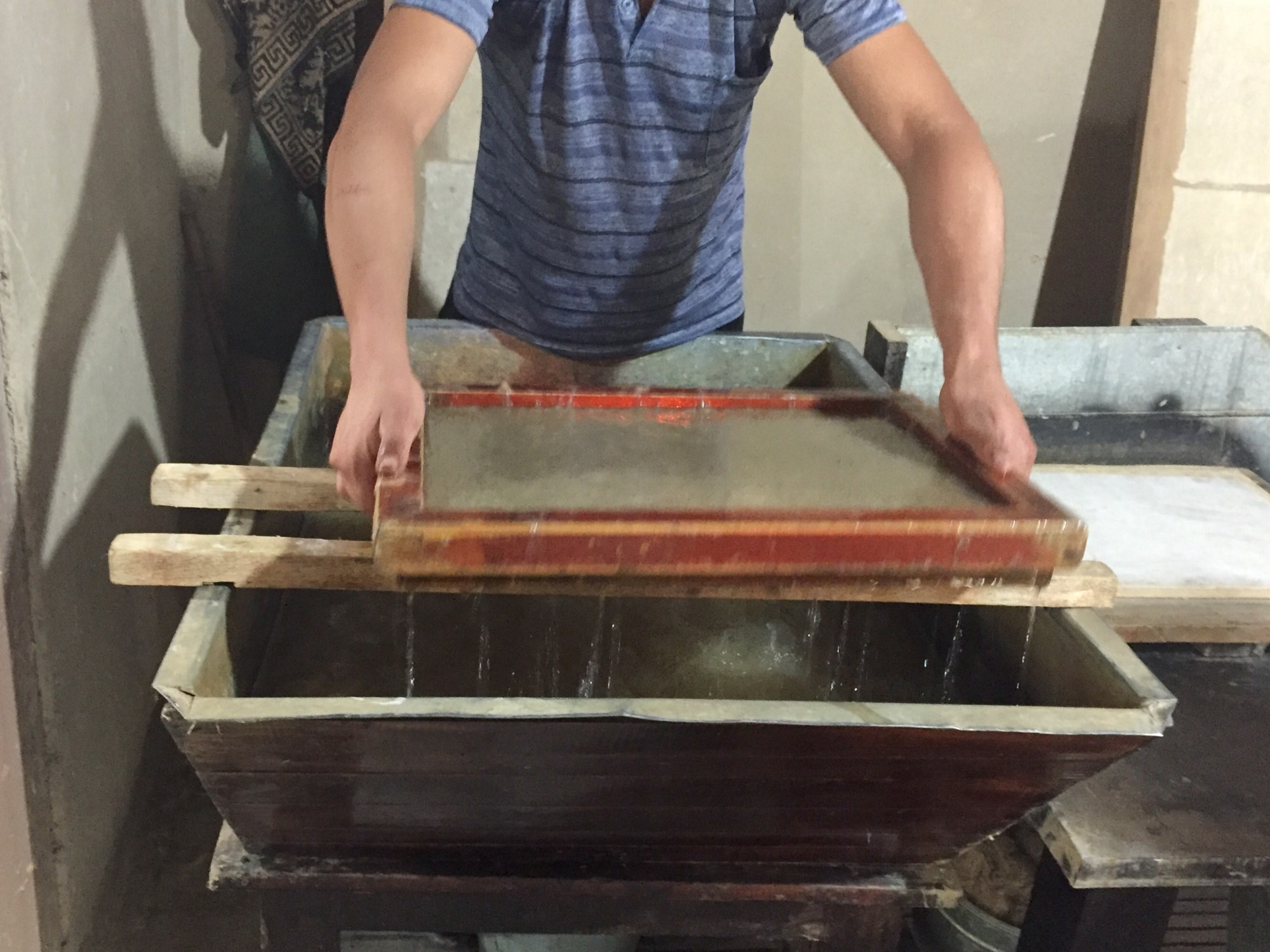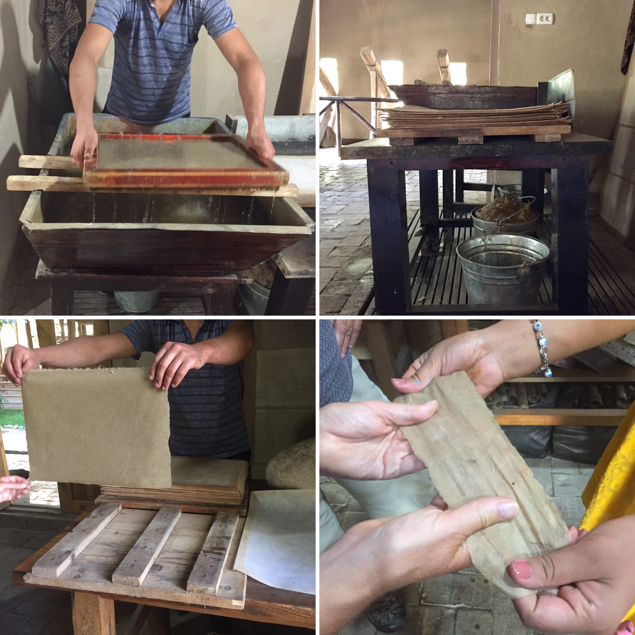 We reached the paper factory/ workshop via private taxi as the centre was 6km out of town and we were 3 (Silvia joined us and she had no bike). The hand painted sign of Meros was pinned against the entrance and a women greeted us. Things had changed since the news article as Meros had adapted for tourists. They had set up a functioning demos and displays ready to be rolled into action when visitors turned up. This was a small scale operation but a genuine one. The workshop was set in a Mulberry wood, with a stream carving its way through the woods. A old water wheel operated the hammers and the general atmosphere was tranquil. In one corner there was a wood mill and a carpenter was making a new water wheel, while at the rear of the woods a women sat on the floor bundling piles of stripped Mulberry branches. Several fires where alight as the vats of Mulberry bark simmered away. A young women sat outside at a table undertaking the bark stripping process by hand and knife. The Mulberry branches would sit in water for several days and then the bark would be finely stripped from the branch and later placed in the vat to be broken down by the fire/heat. The demo then moved inside to show how the water wheel operated the hammer. The bark would then be placed to a bowl like device where the hammer would break down the bark and gradually turn into a fibrous material. This would then be placed into more water and the fine art of creating the paper begins as the young man placed the deckle into the water and produced a thin flat layer of wet fibre. The layer is moved from the deckle onto the pile of other layers spaced in between with thin sheets of a material which prevents the layers to stick together. Under wooden boards and a very large and heavy stone the sheets are pressed to remove excess water and then let to dry on a vertical board. After the paper is dried the finishers goes about burnishing the paper by a shell or stone. This gives the paper a smooth coating, allowing ink work to sit and not bleed. Each sheet takes around 5 mins to burnish.