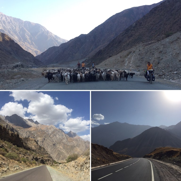 The road is shared with trucks who make the long journey between Dushanbe and into China. Almost everyday a truck driver would slow down and hand us apples or pomegranates, which we always excepted. 4×4 cars are used as taxis here but we found these to be a little free with the road. Many aid agencies 4×4 would also pass us indicating relief work is still an important support structure here. The small villages we passed were normally positioned with fresh water supply and accessible land to cultivate. Children would see you coming from miles and run to the edge or middle of the road shouting and screaming; what is your name, how old are you, or would try and get you to slap hands (more football celebrations) but with both hands needed on the handlebars kids became annoyed at the lack of contact.