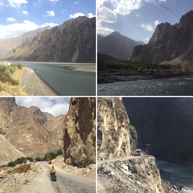 It’s taken 10 days of gravel, off road and tarmac surfaces to reach Khorog, where we are at rest. Our bodies and bikes have been bounced around from the road. At times it felt as if we were in a washing machine’ on a intense cycle. Despite the constant bashing the scenery and riding has been outstanding, some of our best on the whole trip. The mountain ranges have been tireless, with views of snow capped peaks with each turn through the gorges. We have followed the river for hundreds of kilometres and watched how it has carved, twisted and turned the natural boundary between Tajikistan and Afghanistan. I don’t think we had expected to be so close to the Afghan side, which has been fascinating to view the villages, the people working on the land and to stop in awe at the road workers carving a road into the cliff faces. At times as we watched the drill workers they would wave frantically to warn us away as an explosion was due. We would tell the force of the explosions from the rocks on the Tajikistan border which had been blown over. At certain bends in the river you could wave to the Afgani people and the kids would shout greetings. The odd motorbike would traverse the dusty track and you could hear their loud radios playing with a trail of dust left in their wake.