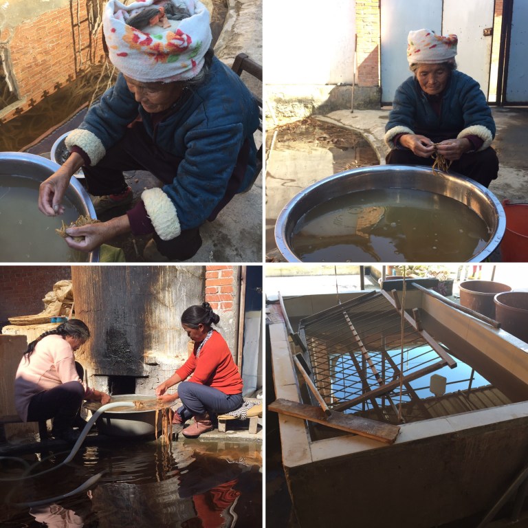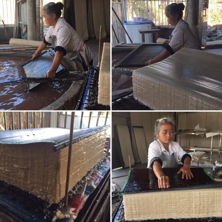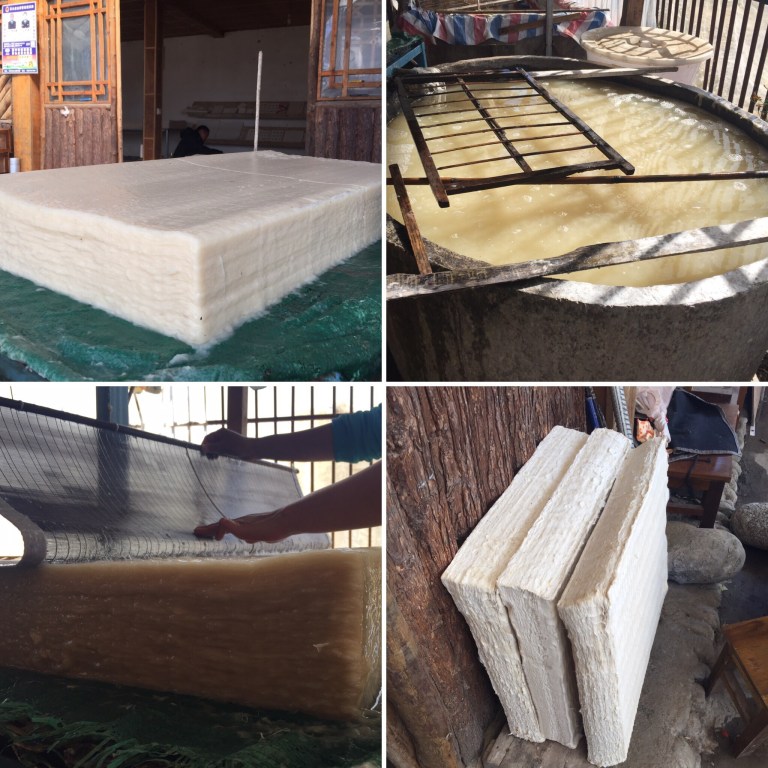 Materials: Mulberry bark (locally called ‘gulpy’, cost 10/11RMB per kilo, sourced locally and from nearby villages), Bamboo mat/mesh / Wooden frame / Wooden batons / Stone vat/bath.