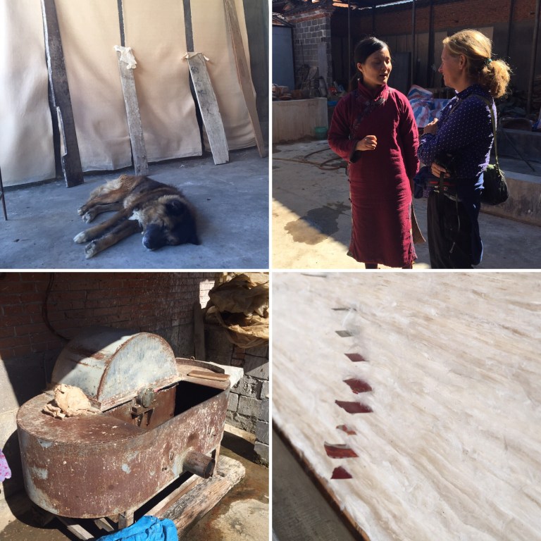 We shared a fabulous lunch of fresh vegetarian dishes with the museum team in the cook’s house. The team returned to their work and Barbara and I went in search of the other 10 papermakers. Paper was left drying outside on the floor, or you would get glimpses of bark, pulp buckets, or stone baths in the entrances of these homes. Poking your head into a courtyard to see any action would normally prompt the papermaker to invite you in and sit to watch them. Women were the master craft papermakers here and this was a truly inspiring thing to witness. Some papermakers were not working as it was market day however, we must have seen 5-6 different workshops in operation.