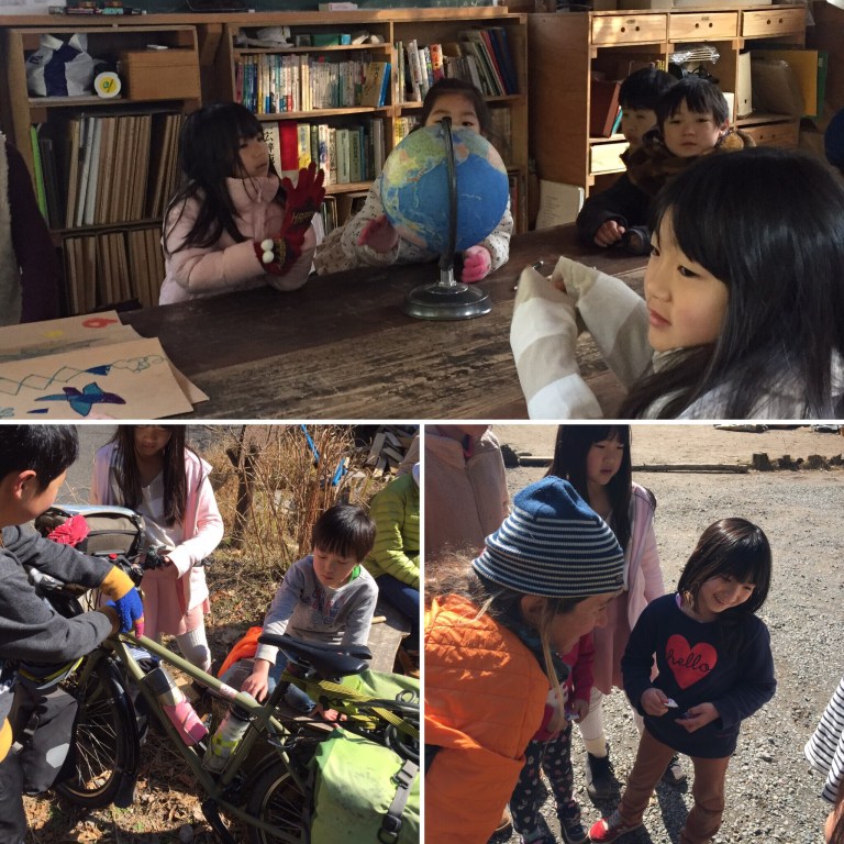 Sayaka dropped us back at the school and we went about cooking and sleeping even though a yurt is so much colder than the tent. In the morning the sound of car doors opening and closing and the chuckles of children filled the grounds. Sayaka asked us if we’d join the group in the morning meeting and present our trip to the kids. All before coffee! 12 children from 4-15 years sat around the large table and greeted us. They passed the globe around the room as kids found out where we both came from and retraced our cycle route. There was something so satisfying to seeing the kids using the globe, no interactive white boards or digital presentations insight. After our brief outline each child told us their names and we finally left them to continue. The school was refreshing, it placed learning on the kids. When I asked Sayaka what she taught she replied “I don’t teach the kids subjects, I mentor and guide them. Children select what they want to learn and we facilitate this”. We meet a couple of parents who stayed around a while and they said there were very few schools in Japan like this. They said their child feels freedom. On a break I played football kick around with a couple of kids and Barbara talked manga, comics with a very entertaining boy called Ricky. I found myself surprised at the freedom the kids had, some played on the roof of the building, other younger girls were using a Japanese saw and hammer to construct a wooden piece, while others ran around and played tag. I wished I had this school experience, as the traditional methods of testing examines was not for me. Sayaka has created a educational haven here and had been a great host.