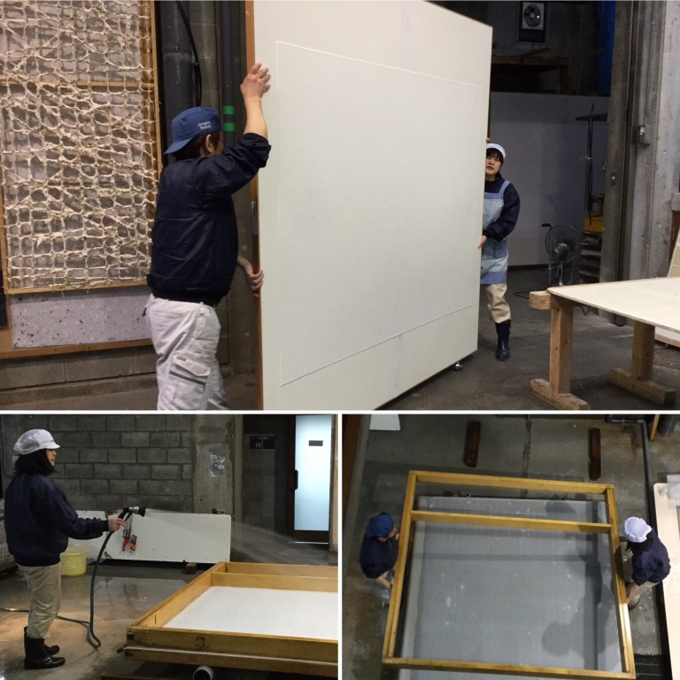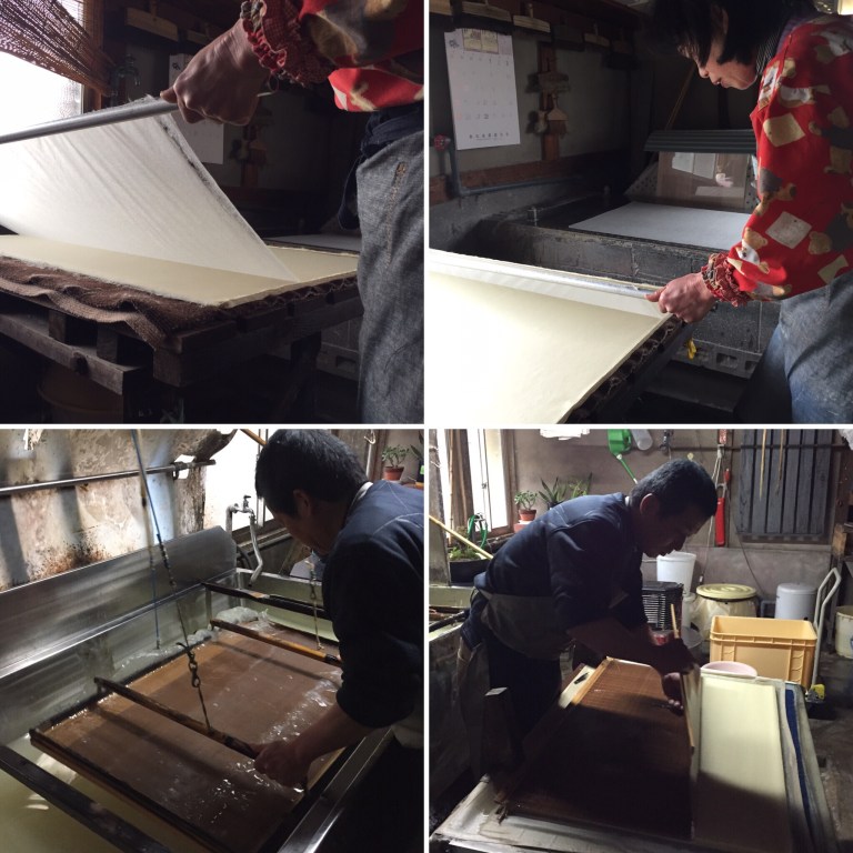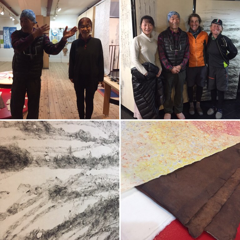 It’s been a while since we posted any paper related information. It’s not that we haven’t been busy, in fact we have 4 visits to summarise in this post. Japan is awash with papermakers and we have had to be selective, as we can not see them all. Our cycling journey began (as you know if you read our last post) in Kagoshima on the island of Kyushu. Our first paper encounter came as a surprise and if we had not used “Warm-Showers” we would have missed this paper visit completely. Sayaka, our Warm-Showers host drove us to her friends washi-studio, a paper making artist. We were welcomed with green tea and our mutual appreciation for paper became our connection. The work we were showed was mainly one off pieces for large screens and wall hangings. We discussed his techniques and use of mulberry bark and bamboo in the production of his creations and he insisted he was not a traditional papermaker but a contemporary artist/maker. He explained he has been self taught and began life as an illustrator. During our tea, he brought down several paper-making books and magazines to show us traditional Japanese paper making methods. Our visit here was a brief one but a great introduction into Washi paper-making. Washi is a term in Japan for handmade paper, Wa meaning Japanese and shi meaning paper.