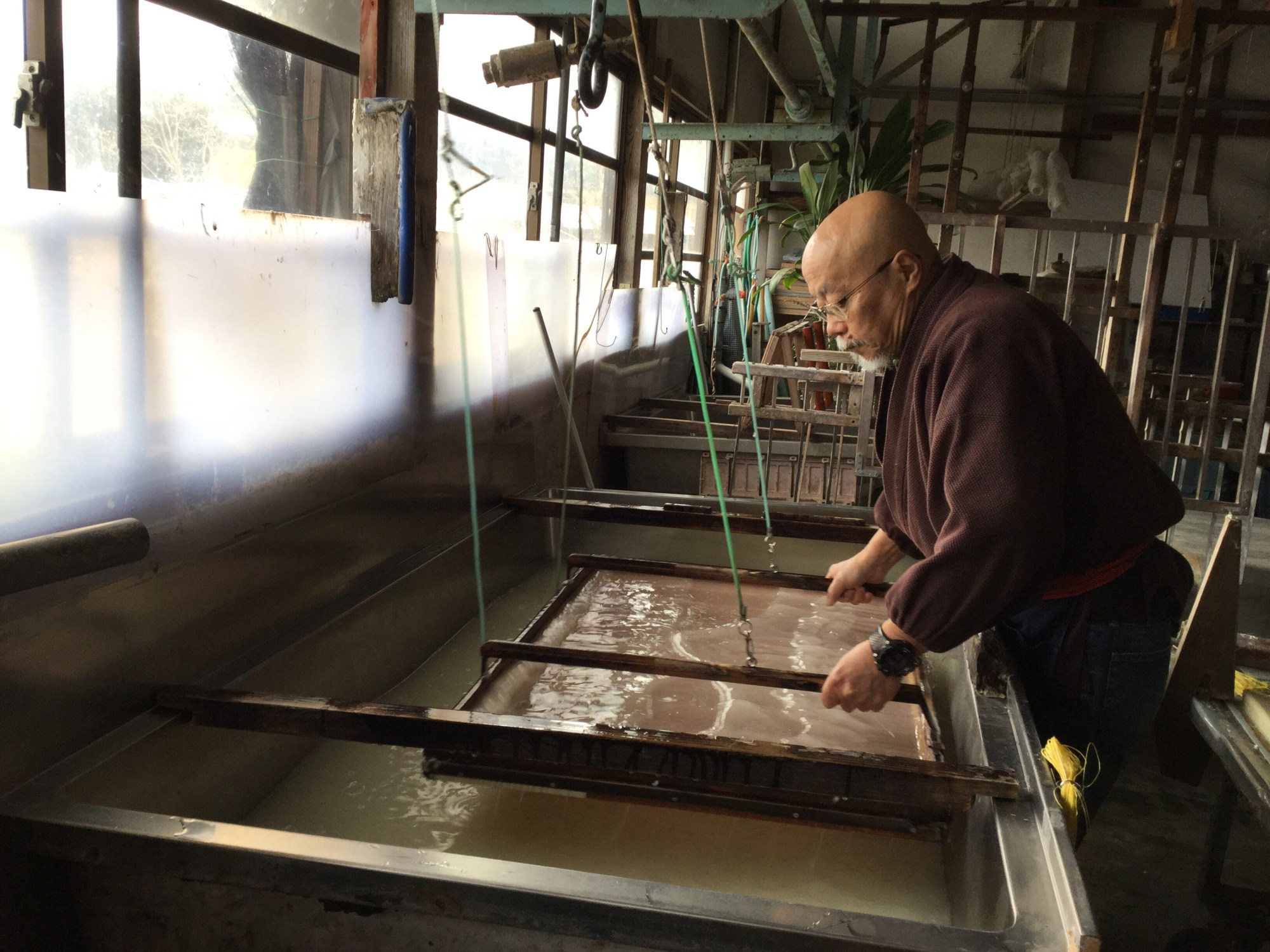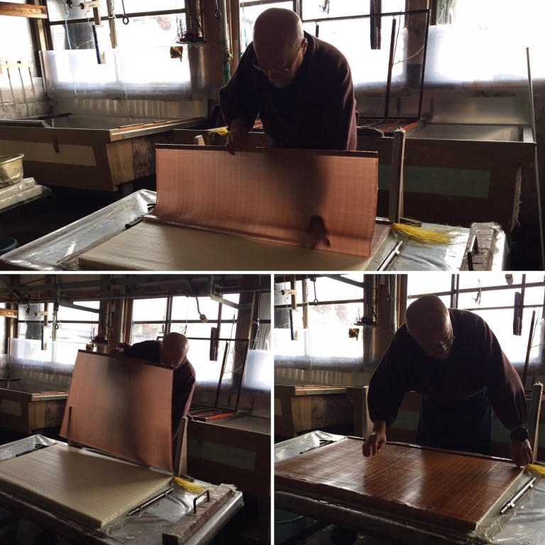 A short ride to the tranquil village on the outskirts of Yame city we meet Toshikazu Mizota, who welcomed us in fluent English. His workshop was divided into 2 main areas, making paper and drying paper. There were numerous wooden frames hanging from the ceiling, even a frame for making paper umbrellas, an enormous wooden press and several other collections of paper making tools shattered around. The atmosphere from the studio was full from years of hard work and skill. The drying room had piles of previously made and dried paper, drying brushes and the staple heated drying table. We bombarded him with questions as he went about demonstrating his technique with fluidity. His frame was attached to elasticated pulleys which where attached to bamboo poles, this allowed give in the movement when dipping the frames into the water/pulp mixture. He had been making paper for the past 20 years, a craftsman who’s specialism is within conservation papermaking, which is very fine, semi transparent and extremely strong. His work is in the British library and his conservation paper is used world wide.