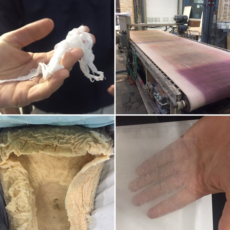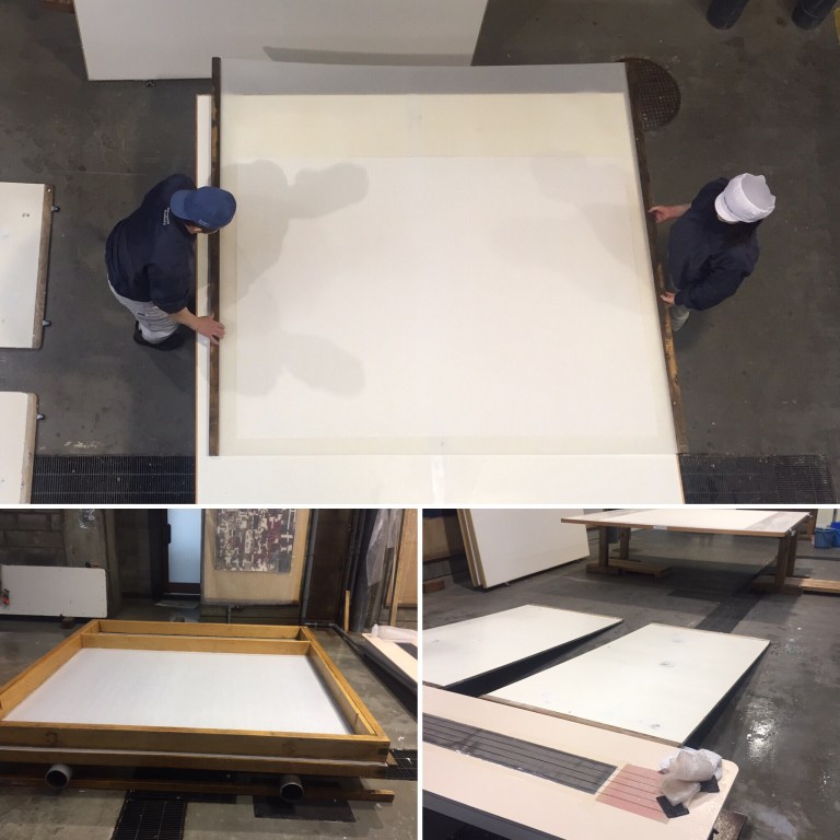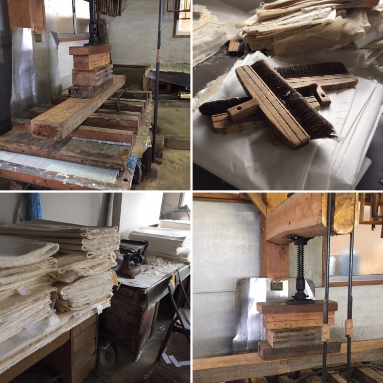 The mill had all the normal fit out for a large hand made papermaker. But there were some clear differences from others we had visited. Two papermakers were making extremely large sheets, which would be used for inkjet printing. We viewed this from the second floor viewing platforms and the skill and care involved was very high. One large wooden frame and mesh screen where filled with paper pulp via buckets and then lightly showered (to allow the fixing agent to be moved). The big frame was pushed backwards and forwards by hand for the frame was seating on top of two metal tubes. The movement was, as it happens with small frames, joining the fibres together to form the sheet of paper. The formed paper was then moved to two angled table tops and the paper was carefully removed from the screen (see clip at end of post), by folding the screen backwards.