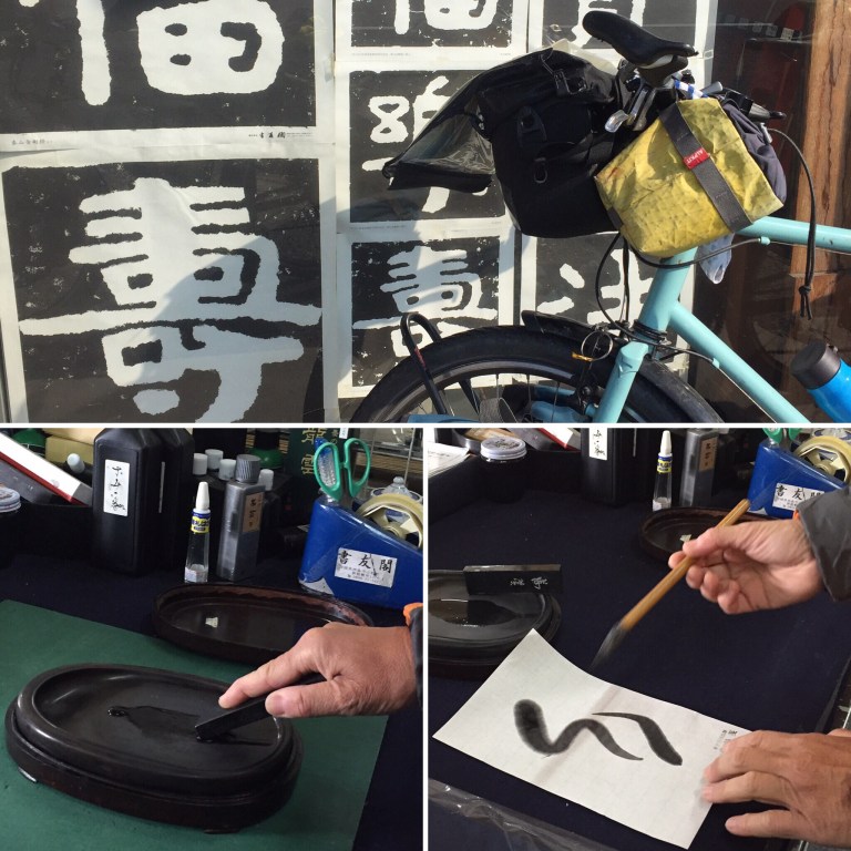 During our cycling to paper makers and obviously soaking in all things Japanese, we saw how paper is an integral aspect of Japanese life. From the paper in homes from lampshade, screens, wallcoverings, to printed and hand written pieces as calligraphy. We passed through Kumano where 80% of all calligraphy brushes are made. Stepping into a calligraphy shop is pawn to us and seeing hundreds of different brushes, inks and accessories was impressive. One owner gave B the opportunity of trying out some ink and a brush and then gave us coffee and an adresss in Tokyo to visit.