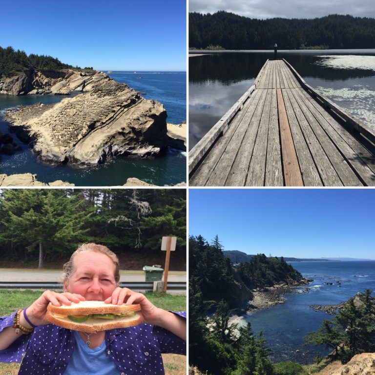 After 4 days of long cycling days the 3 of us woke up exhausted and this prompted an unplanned rest day at an idyllic spot. The night before we arrived at a hike biker site to experience art rather odd atmosphere, which we had experienced the previous night and decided to avoid a similar night. The previous night we had settled into our hiker biker site by celebrating the end of the day with a cold beer and 2 people entered the site heads down, hoods up carrying their bags. Their was no acknowledgement of our presence and their was certainly an odd atmosphere. The couple did not seem to be hikers or their were no bikes in sight. Fast forward to the next night we approached the site and a dog began barking at us and again a women gave no acknowledgement of us, another odd atmosphere, so this is when we decided not to have another uncomfortable night so Marie cycled to the next forestry park. She came back smiling saying the camping hosts will allow us to camp there for free. We had a perfect spot right on the ocean front, under frees with the sound of the sea was intoxicating. As we awoke the next day exhausted from the previous days head winds and long miles Marie asked the hosts if we could stay another night. They were very generous and we spent a perfect day each resting, walking on the beach, eating and even an afternoon nap at Tilliacum. We met Jeff from Portland on the beach and he chatted to us about the magical place of Cape Perpetua and the unusual experiences he had there. The following morning he loaded us up with energy bars, bagels and cream cheese.